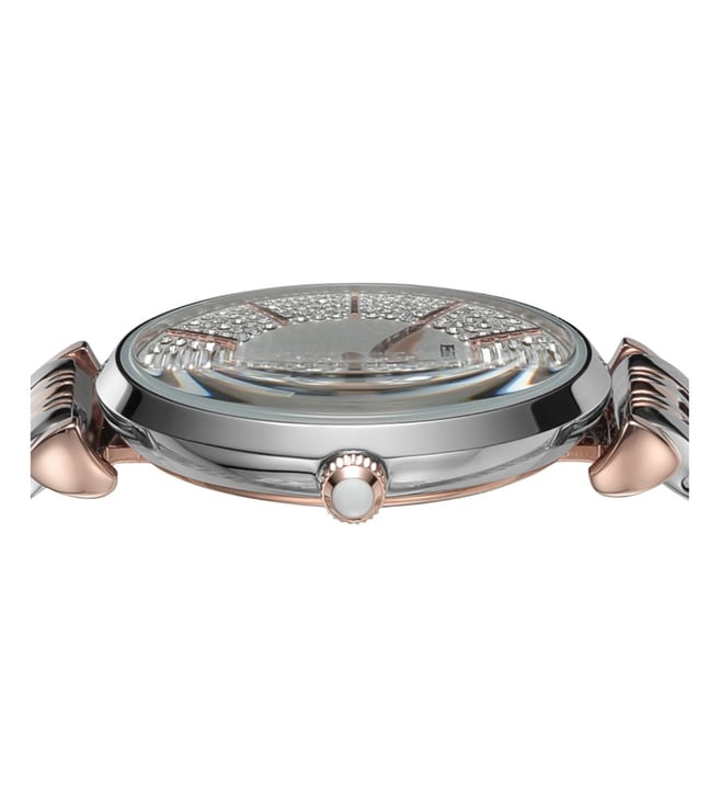 32mm watch features a silver glossy sunray dial, two-hand movement, at least 50% recycled stainless steel case and two-tone stainless steel bracelet.
